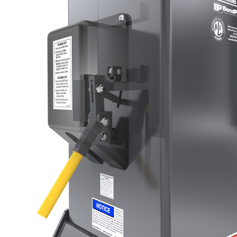 BendPak’s patented automatic safety lock system ensures automatic engagement throughout lift rising operations. Its ergonomic single-point release mechanism enables operators to effortlessly disengage the safety locks during descent with a single finger, enhancing efficiency and safety.