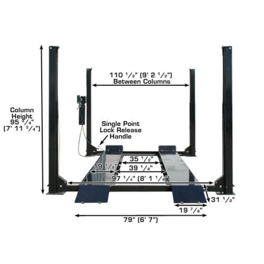 The Atlas® APEX9 ALI certified 4 post lift is a heavy duty hobbyist and commercial grade lift and is a true 9000 LB lift. The APEX9 is extra long and allows the lift to handle some of the longest wheel base vehicles out there. The APEX9 is also extra wide allowing even Diesel Duallys to be driven onto the runways. The APEX9 also features extra lift height so everything from Smart Cars® to a Dually can be parked both below and on the runways.
