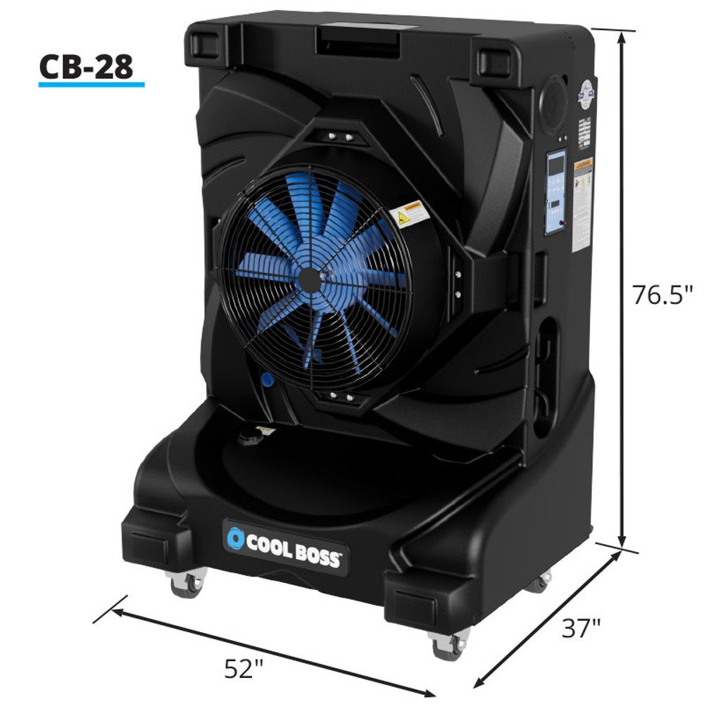 The CB-28 is a medium-duty commercial-grade cooler that is well-suited for large industrial space cooling. When temperatures rise and you’re looking for a cost-effective cooling solution, look no further than Cool Boss. The CB-28 evaporative cooler puts out big air – exactly what you’d expect from the world-leader in commercial-grade cooling technology. Use it indoors or out and help turn summer to winter with just everyday tap water. Even though the CB-28 is equipped with a whopping 80-gallon auto-refilling reservoir, because of its abundant water-holding size, it can literally run for hours without the need for refilling, just in case you’re using it where no garden hose is available. With an air delivery of 10,645 CFM and coverage of 2,510 square feet, it’s no wonder that the CB-28 is one of our favorites and our customers’ too.