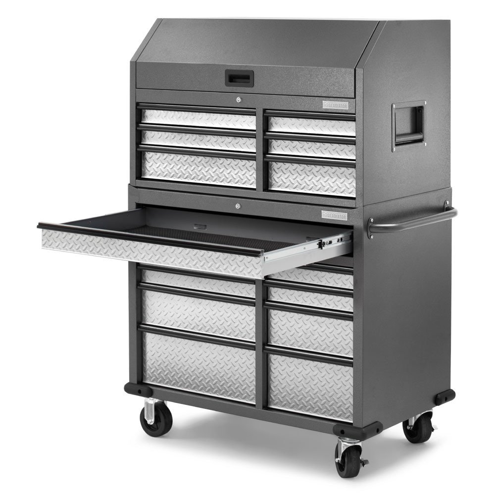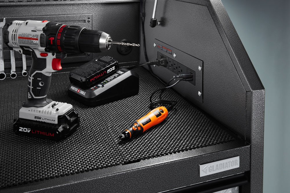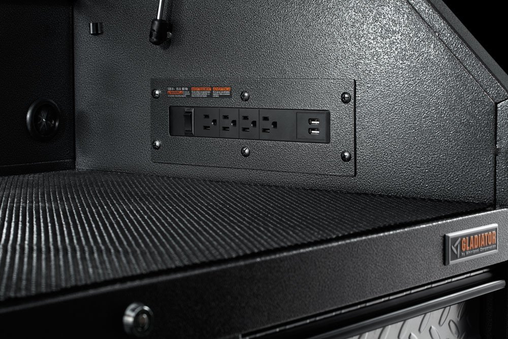Gladiator 15 Drawer Mobile Tool Chest Combo. Take tool storage to the next level with the Gladiator 41″ 15 Drawer Cabinet Chest Combo. This heavy-duty tool chest features welded steel construction that can hold up to 1500 lbs: plenty of strength to handle your heaviest gear. Each of the 15 soft close drawers can handle up to 100 lbs each and feature cushioned liners, preserving the integrity of your tools and keeping your drawers scratch-free. 5″ sturdy casters with easy lock and release mechanisms are designed for easy maneuverability on uneven surfaces, so you can always have your tool chest close at hand, while the integrated power supply, featuring USB ports, keeps your devices and tools charged so you can keep working. The 41″ 15 Drawer Cabinet Chest Combo is covered by Gladiator’s limited lifetime warranty, so you can have full assurance that it will withstand a lifetime of wear and tear.