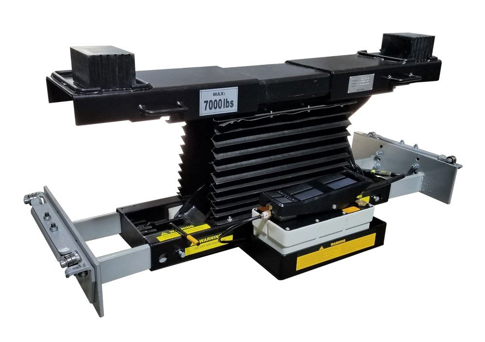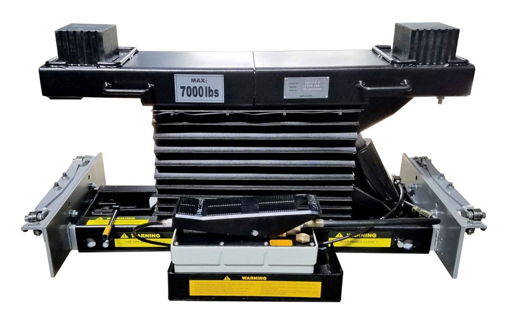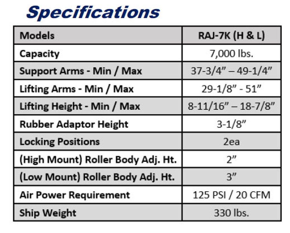 The iDEAL RAJ-7K-H & RAJ-7K-L Rolling Bridge Jacks are high quality, automotive frame engaging 7,000 lb. capacity, pneumatic / hydraulic operated, scissor-style rolling bridge jacks, designed to be easily mounted on most four post or scissor lift’s jack rails to expand the lift’s service ability. Both jack models are designed to lift either the front or rear wheels off the runways to provide ‘wheels free’ service for brake, suspension, tire repairs or general maintenance jobs. The iDEAL RAJ-7K Jack models include ‘exclusive’ universal roller body brackets designed for either ‘High Mount’ or ‘Low Mount’ jack rail configurations for commercial four post or scissor lifts with integrated jack rails between the runways. The iDEAL RAJ-7K’s exclusive design incorporates ‘spring loaded’ adjustable width & height roller body support brackets, allowing for the best fit to runways, while the dual-precision roller bearing guide wheels ‘track’ on the top edge & side of the jack rails, ensuring for smooth & safe long-term rolling operation. The RAJ-7K Jacks also come standard with a pair of rubber pad adaptors, protective scissor side skirts & high-quality pneumatic / hydraulic pump for premium, commercial grade rolling bridge jacks, all for an unmatched value!