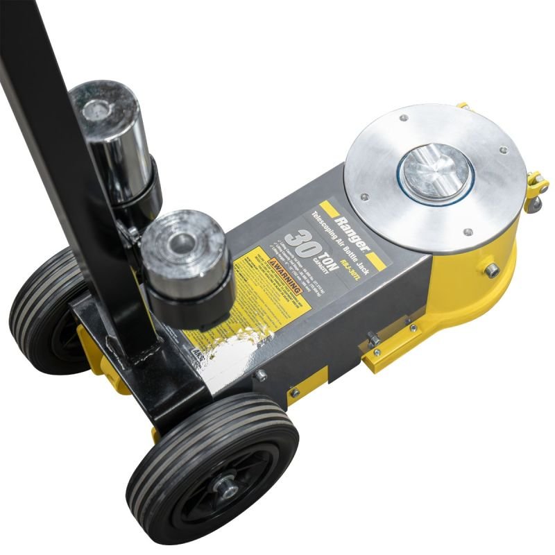 Ranger’s RBJ-30TL garage floor jack stands as a testament to the power of air-hydraulic technology. This powerhouse is the most robust in Ranger’s lineup, effortlessly handling an impressive 60,000 lbs. in the first phase position and 30,000 lbs. (15 tons) at the 12” max lifting height. Tailored for heavy commercial use, the RBJ-30TL boasts a long “T” handle for easy positioning and large rubber wheels for smooth maneuvering around the garage.