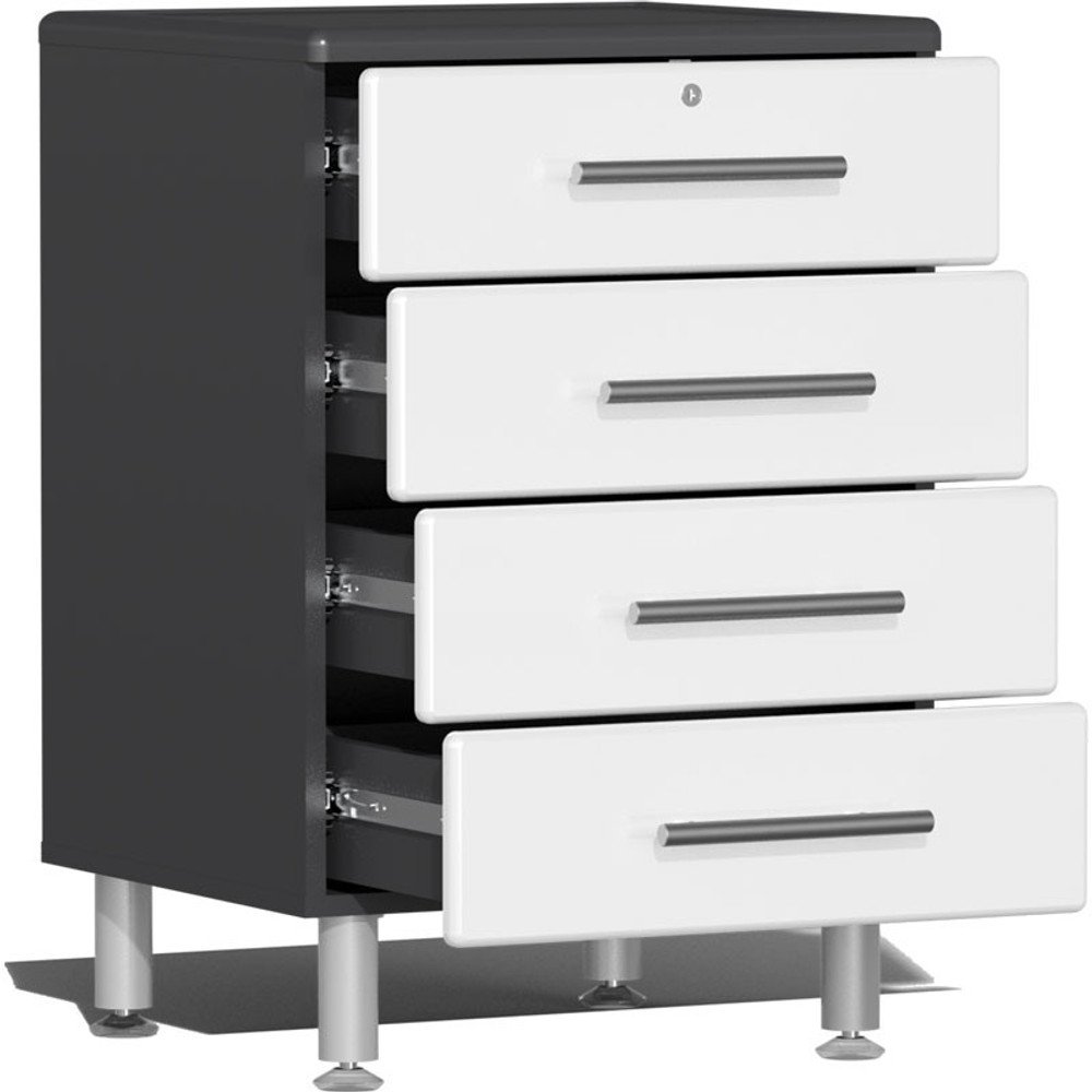 Ulti-MATE Garage 2.0 Series takes the back-to-back Consumers Digest awarded “Best Buy” cabinet line features to the next generation. Five (5) piece set with eco-friendly solid Bamboo worktop provides oversized shelf and drawer organization. Nearly 9-ft of infinite single or multi-wall modular design options (pictured 8.86 ft). Contemporary car metallic color facing, industrial strength 1-inch thick shelves, soft-close hinges, smooth operating full extension ball bearing drawer glides and custom shop radius profile are just a few high-end features to take your garage or workshop to the next level.